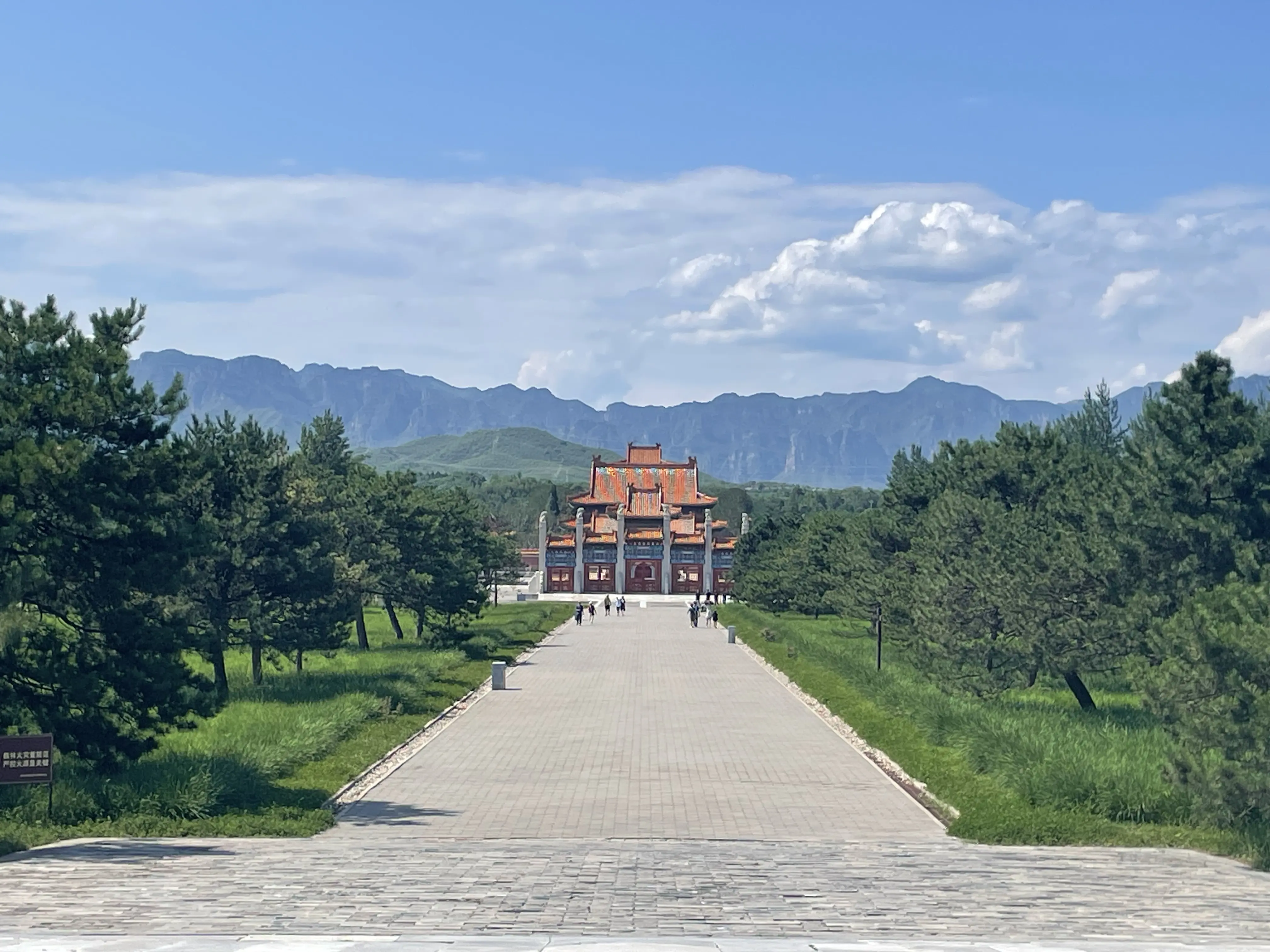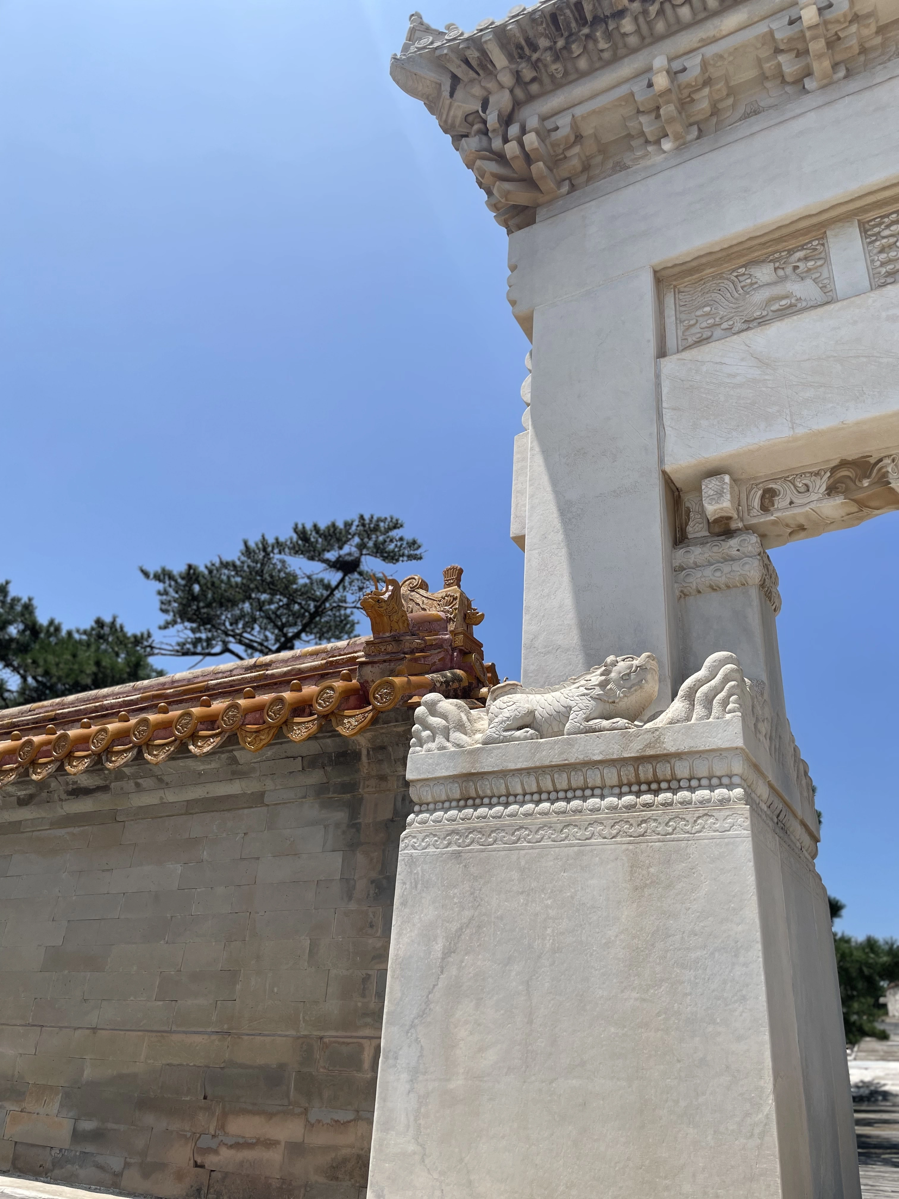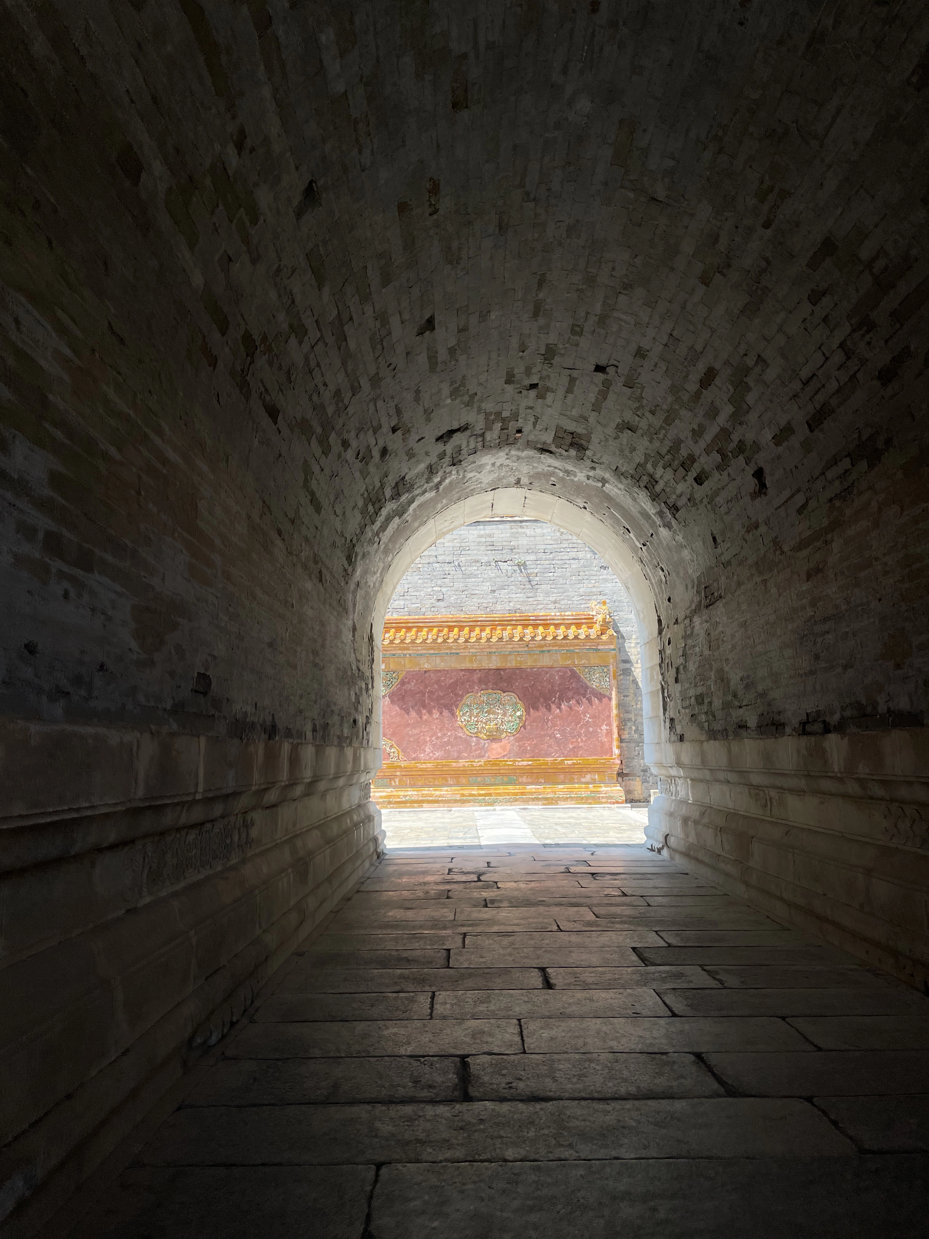 From Chengdu, Jasper and Calder flew to Japan, and I headed to Beijing for a few days. My family has always really liked 明十三陵 (the Ming Tombs), which is closer to where we live, in the north of Beijing. This time I was staying with a friend who lives in the south of the city, so we drove all the way to 清西陵 (the Western Qing Tombs) in Baoding, Hebei. The Qing tombs are laid out similar to the Ming tombs: The central tomb (usually the emperor who first chose the place) stands against the backdrop of a wall of mountains to its north and faces open land in the south, with two smaller peaks at its left and right, resembling a throne. The rest of the tombs are scattered in the crooks of the mountains nearby, all with their backs to the mountains and fronts to the shared open plain. The mountains here are a branch of the Taihang mountain range, which stretches from Beijing southward to form the natural border separating Shanxi to its west and Hebei + Henan on its right. Since the tomb complex is relatively far from the cities, it is much less popular than the Ming tombs. This meant two very nice things for me: one, it was basically empty when we went, thus a rare relaxing experience; and two, they are in less of a hurry to finish restoration. So several of the main halls still maintained parts of the original build (which is not crazy, since many of these were built in the last century), with the roof tiles still the original glaze and some of the indoor columns with their original decorative tiles. 慕陵 (tomb of 道光) had a beautiful main hall built entirely of 金丝楠木. 崇陵 (tomb of 光绪) was robbed in the civil war, so its underground chamber was excavated and open to the public. I always wonder what the state of archaeological conservation technology is and to what extent it’s a matter of funding; it would be cool if we can start safely excavating (or at least getting better scans) of these tombs within my lifetime.
