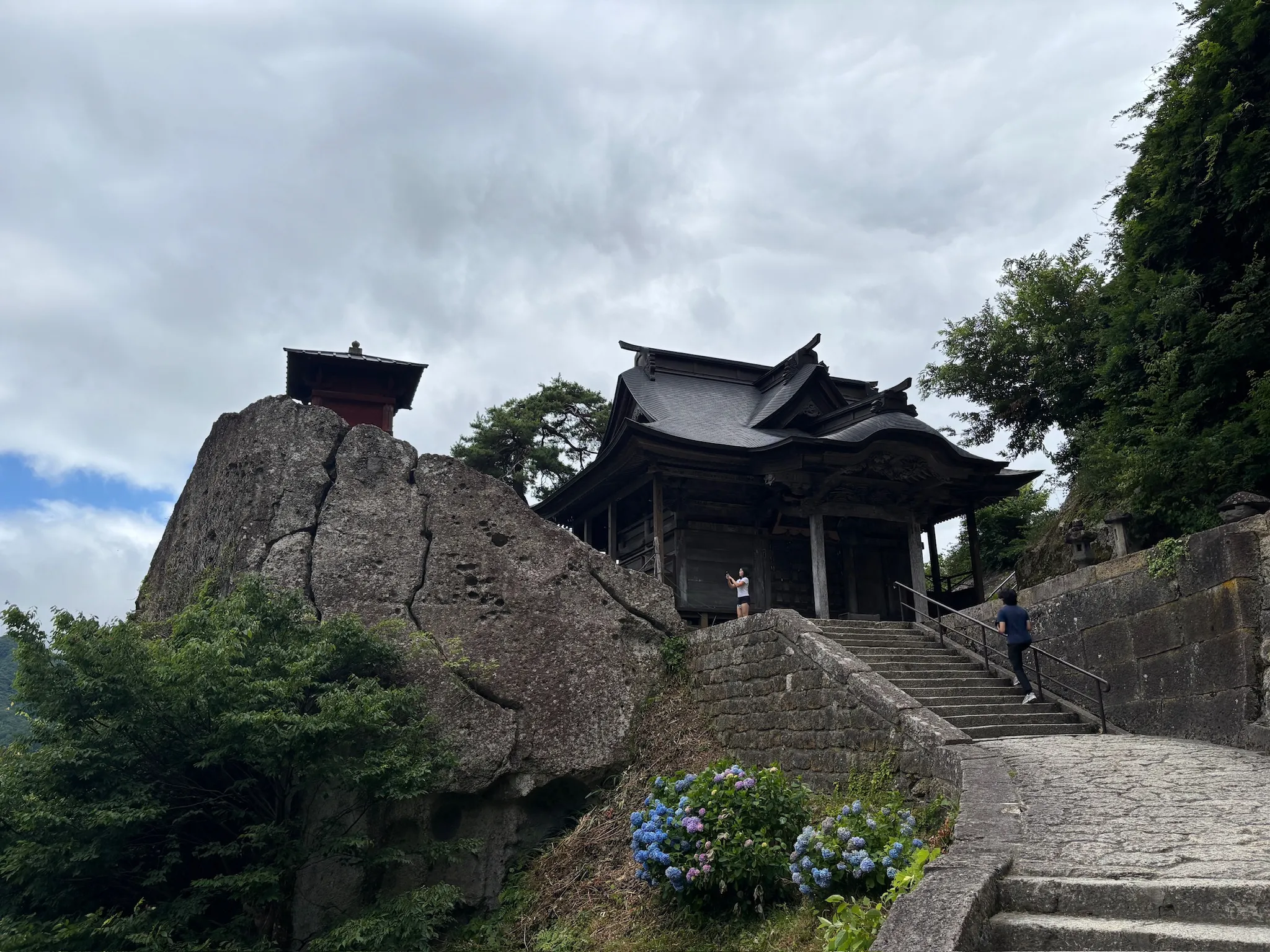 After taking a photo with the owners (which may now be up on their wall), we headed to the temple. The temple, as implied in its colloquial name (Yamadera, or mountain temple), is at the top of a small mountain. The short trek up was fairly nice; in the shade of big pines, with bushes of wild hydrangeas scattered along the path. This trek was the subject of one of Basho’s most famous haikus. (I read Narrow Road to the Deep North before this trip, but honestly didn’t get much from it; I think haikus rarely survive translation.) The nicest part, though, was the view from the top. You could see the whole of the town spread across the shallow valley, with a train running through the center. We even found the old couple’s restaurant off to the right. I find that the views in Japan are not as grand as many mountains in China or valleys like Yosemite, which make you look up and feel things much bigger than yourself. Instead, the views in Japan are human-scale; they distill parts of a very familiar and everyday sort of life, like the valley town here, and even the nature presents a beauty and care that feels reachable by us, like in Matsushima Bay.