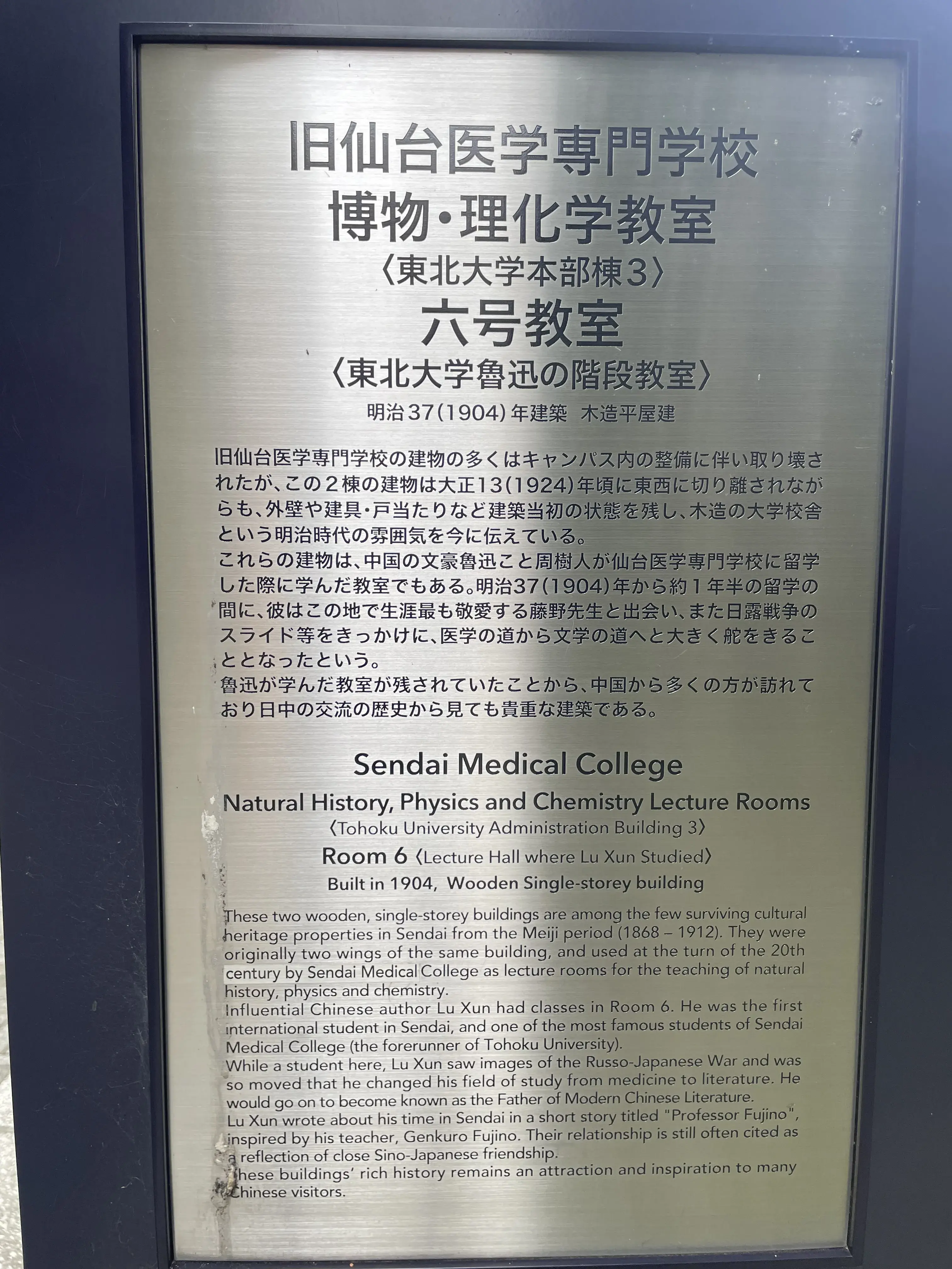 One of the reasons I was originally interested in Sendai was because Lu Xun studied at Sendai Medical College (now the Tohoku University Katahira Campus) in 1904–1906, which he famously wrote about in the preface to Call to Arms (《呐喊》, a collection of short stories about revolutionary China that are considered the beginnings of modern Chinese literature) and “Mr. Fujino” (《藤野先生》). In the preface to Call to Arms, Lu Xun describes watching images of the ongoing Russo-Japanese War projected in his lecture hall in Sendai, seeing the apathy of Chinese onlookers to the execution of a fellow Chinese man deemed as a Russian spy, and thinking that what the country needed was not Western medicine but to change the people’s spirit. He cites this as his turning point away from medicine into literature. The subject of “Mr. Fujino” is his relationship with his anatomy professor at Sendai Medical College, whom he holds in deep regard.